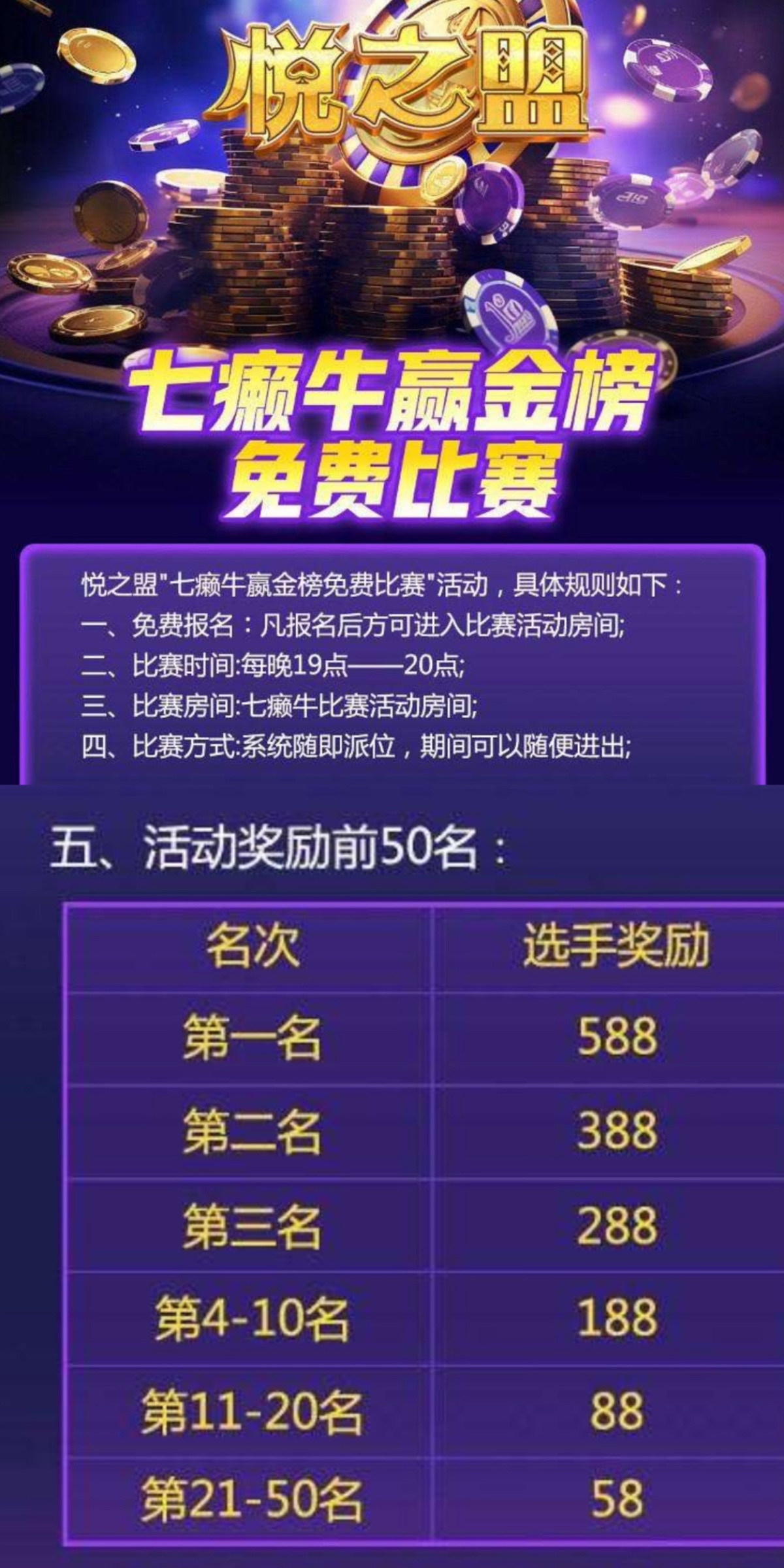 每晚7-8点打榜比赛,得提前报名参赛,否则到点没有比赛资格,前50名都有奖励58-588,上榜的奖励结束后会派发到银行里 彩金一倍水就能提款