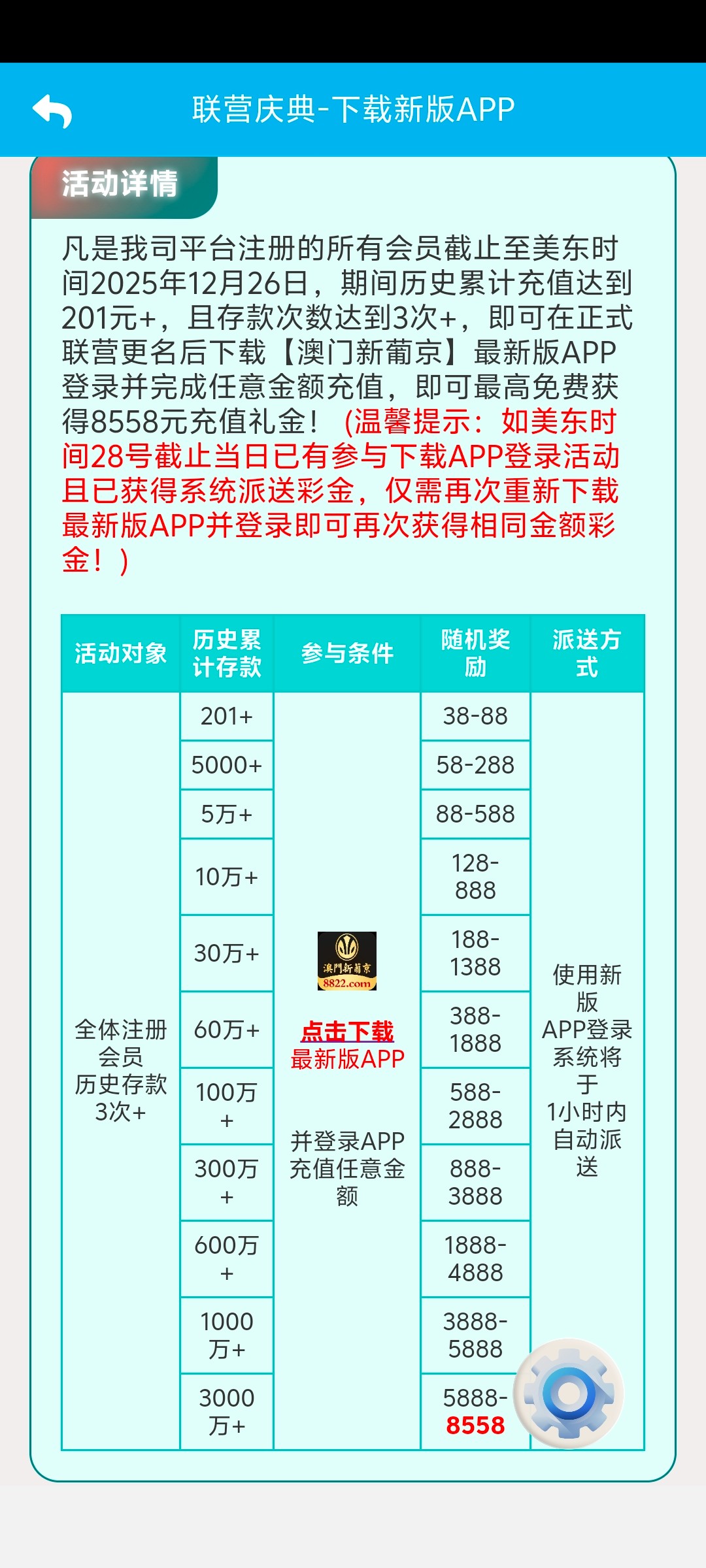 昨天12.28下载新版app领了58彩金的,今天再次重新下载再送一次。另外原8558的今天也可以参加这个app活动了