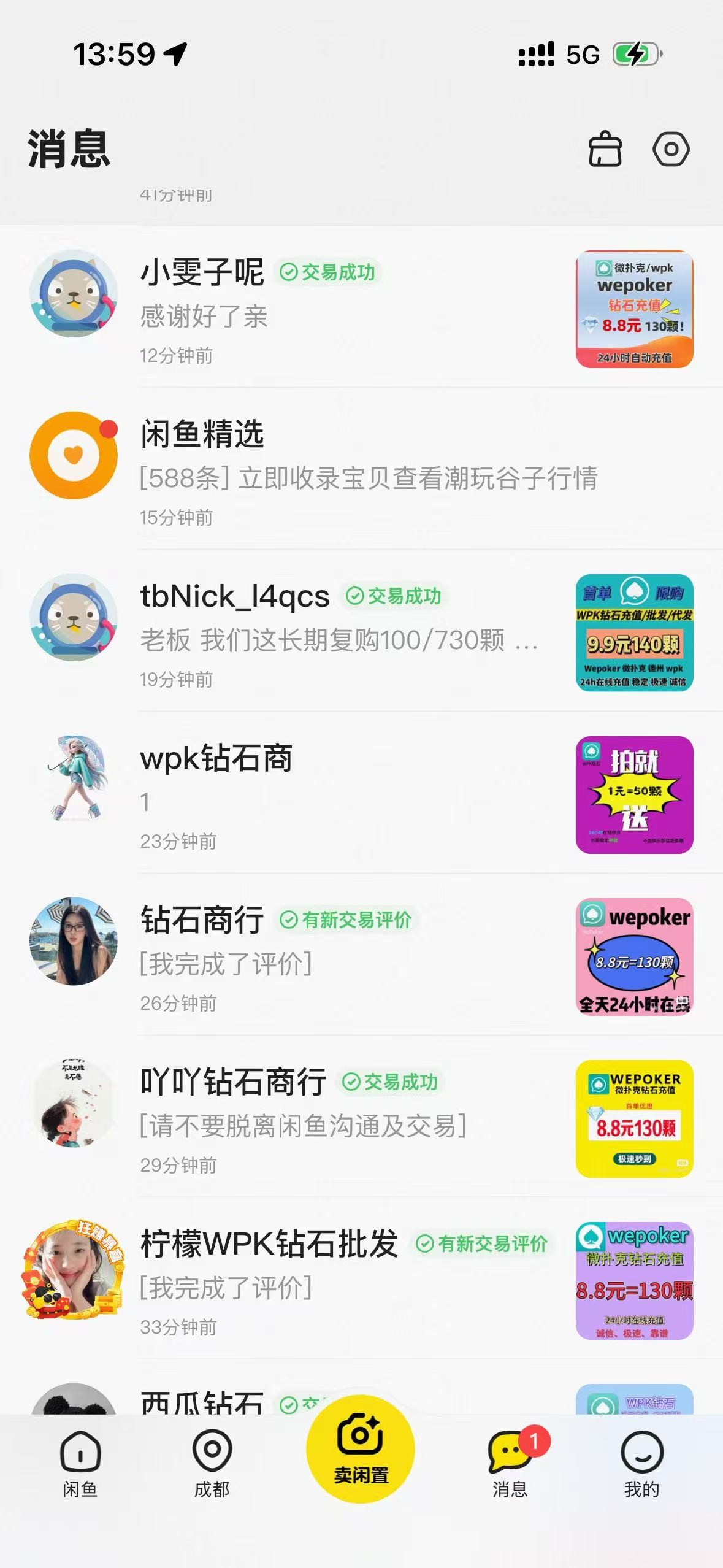 相信很多老哥都知道Wpk了,它里面的钻石也是很值钱的 0.128一个 闲鱼上面8.8可以买130个 准备好70左右的本金 买一单赚8块(首单福利)多换几个商家买够1000个钻石就可以随便找一个信誉好的商家回收 闲鱼号多无限撸 一个号差不多可以赚60 我目前搞了三个号赚了160左右 相当于70块本金变128【绝对的首发教程,薅到羊毛了,打赏点金币】